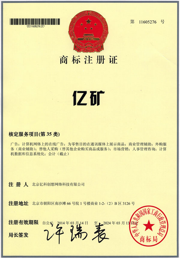 近日,山东中煤集团旗下子公司山东亿煤机械装备制造有限公司和北京亿科创想网络科技有限公司分别成功获得“亿煤”和“亿矿”商标注册证。